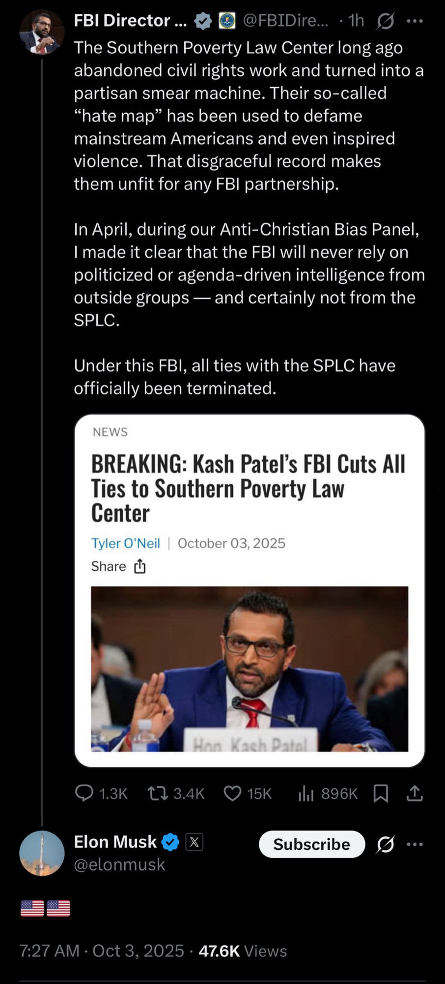 The FBI, under Director Kash Patel, announced it would end its collaboration with the Southern Poverty Law Center (SPLC), severing a long-standing association in which SPLC supplied research, data, training, and intelligence support on hate groups and extremist organizations.